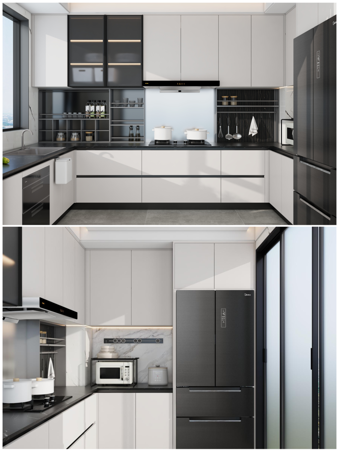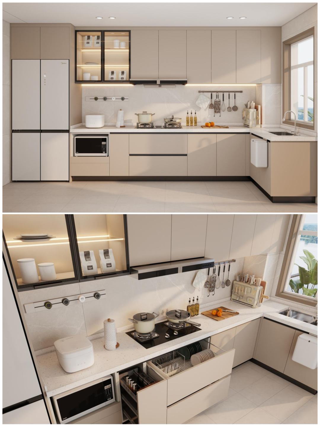 空間利用(yong)率高(gao),轉角設(shè)計(ji)形成(cheng)洗切炒黃金三角動(dòng)線(xiàn)📐可(kě)利用(yong)轉角櫃安(an)裝(zhuang)旋轉拉籃或飛碟拉籃,提升收納能(néng)力(li)