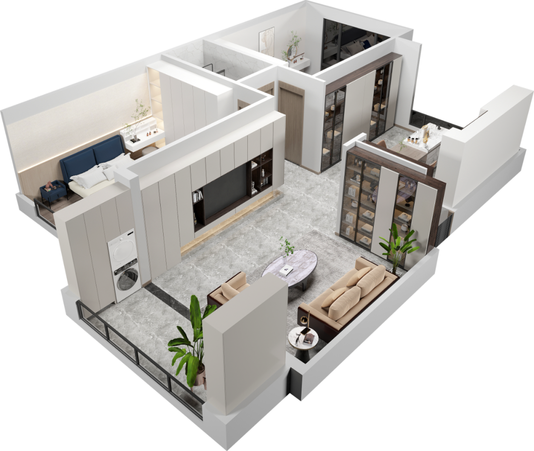 主(zhu)卧延續了(le)全屋的(de)極簡風格,頂天立地式(shi)衣櫃與玄關櫃、電(dian)視櫃的(de)極簡設(shè)計(ji)相呼應,線(xiàn)條幹練流暢。