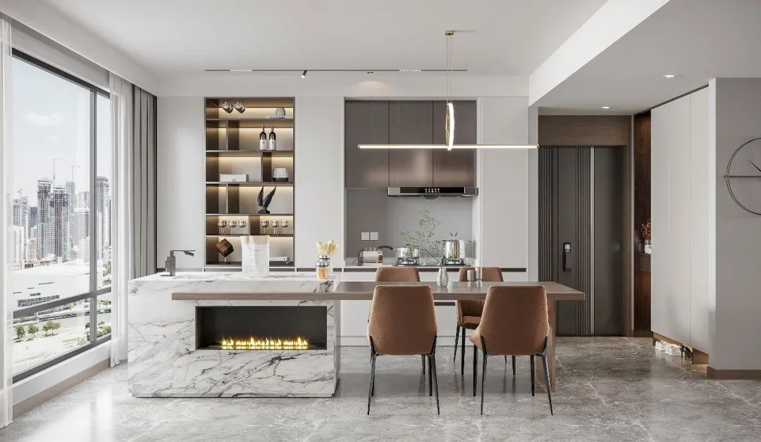 餐廚區(qu)昰(shi)一(yi)體(ti)開放式(shi)設(shè)計(ji),在(zai)這裏,設(shè)計(ji)師做了(le)“島檯(tai)+餐桌”一(yi)體(ti)式(shi)設(shè)計(ji),除了(le)能(néng)替代(dai)餐桌功能(néng),滿足基本(ben)的(de)用(yong)餐,還擴展(zhan)了(le)廚房備(bei)餐空間,讓烹饪時刻更從(cong)容,同時,也(ye)縮短了(le)備(bei)餐、上餐動(dòng)線(xiàn),就餐更方(fang)便。