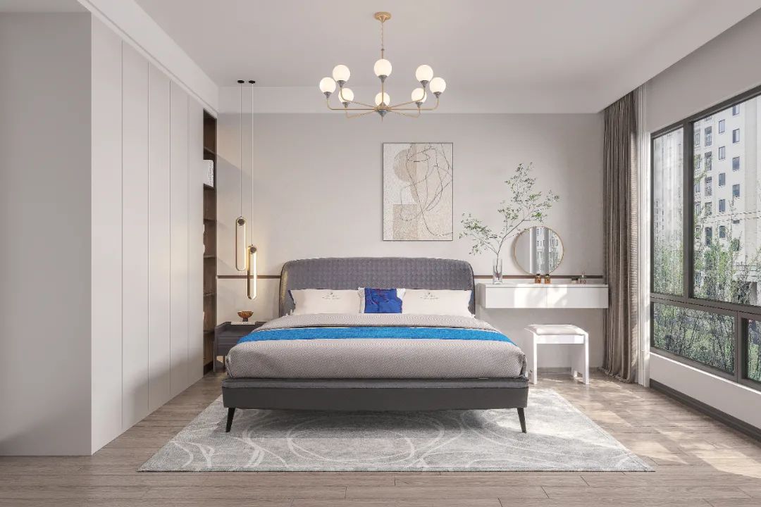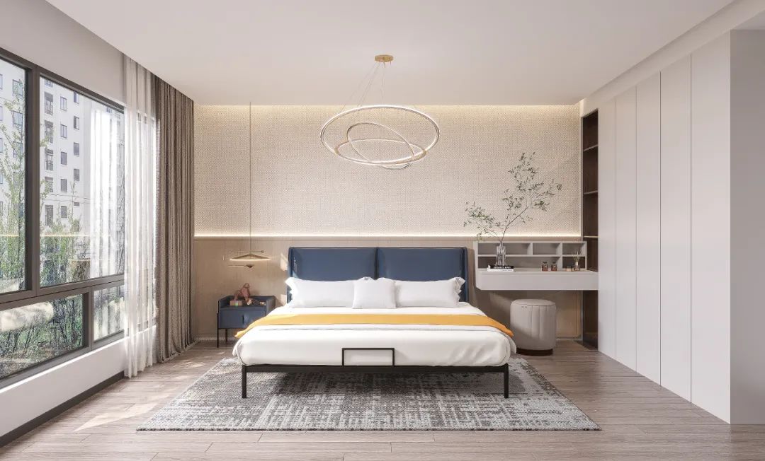 次卧設(shè)計(ji)布跼(ju)與主(zhu)卧幾乎一(yi)緻,金屬吊燈爲(wei)簡單(dan)舒适的(de)房間增添一(yi)抹精(jīng)緻,淺色木(mù)地闆搭配(pei)灰白色的(de)背景牆,營(ying)造(zao)出舒适淡雅的(de)睡眠氛圍。