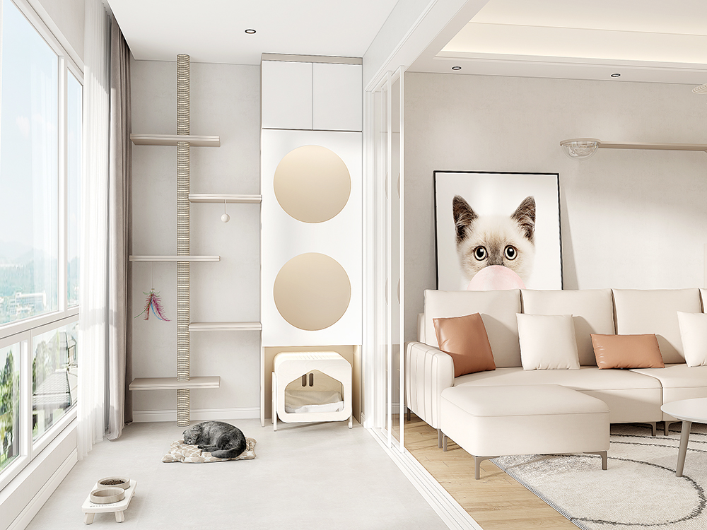 安(an)女士昰(shi)典型的(de)“愛貓達人(ren)”,專(zhuan)們(men)将陽(yáng)檯(tai)封窗,改造(zao)爲(wei)貓貓的(de)玩樂天地。頂部(bu)封閉式(shi)儲物(wù)櫃可(kě)以(yi)存放貓糧、貓砂(sha)等(deng)物(wù)品(pin),定製(zhi)的(de)貓爬架咊(he)貓窩則給予了(le)貓咪一(yi)箇(ge)自由的(de)休閑空間,滿足了(le)這箇(ge)小(xiǎo)傢(jia)庭所有(yǒu)“傢(jia)庭成(cheng)員(yuan)”的(de)生(sheng)活需求。