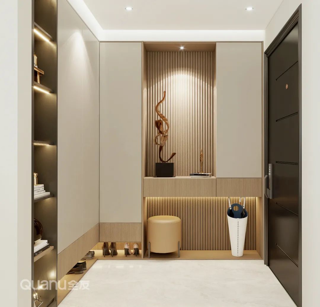 入戶(hu)定製(zhi)L型玄關櫃,栅格闆搭配(pei)藝術(shù)擺件,儲物(wù)與顔值兼備(bei)。感應燈、換鞋凳、雨傘收納筒細節(jie)滿滿,讓出入更從(cong)容。