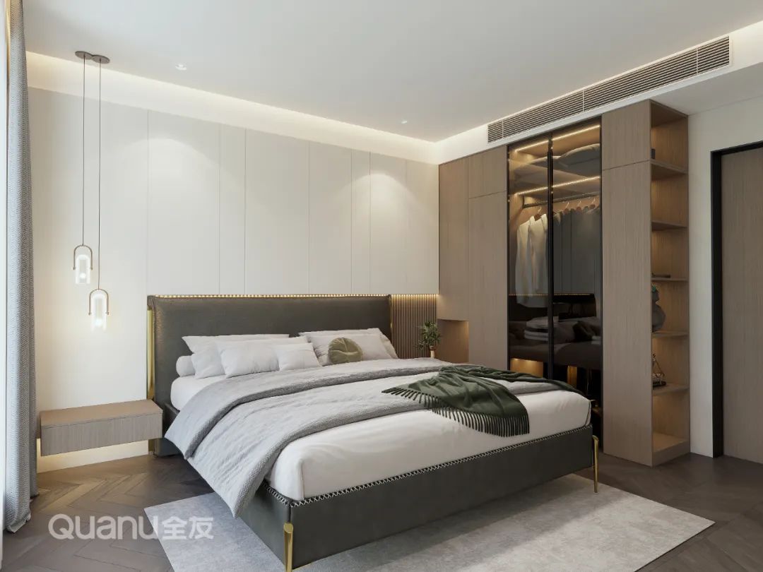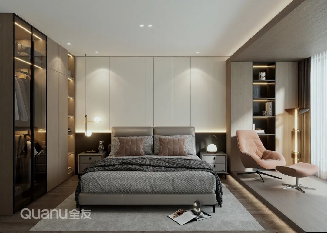 步入主(zhu)卧,玻璃、燈光、皮革、原木(mù)互相搭配(pei),營(ying)造(zao)出高(gao)級而優(you)雅的(de)睡眠氛圍,同時擡高(gao)陽(yáng)檯(tai)定製(zhi)地檯(tai),一(yi)箇(ge)氛圍感休閑區(qu)便悄然誕生(sheng)。