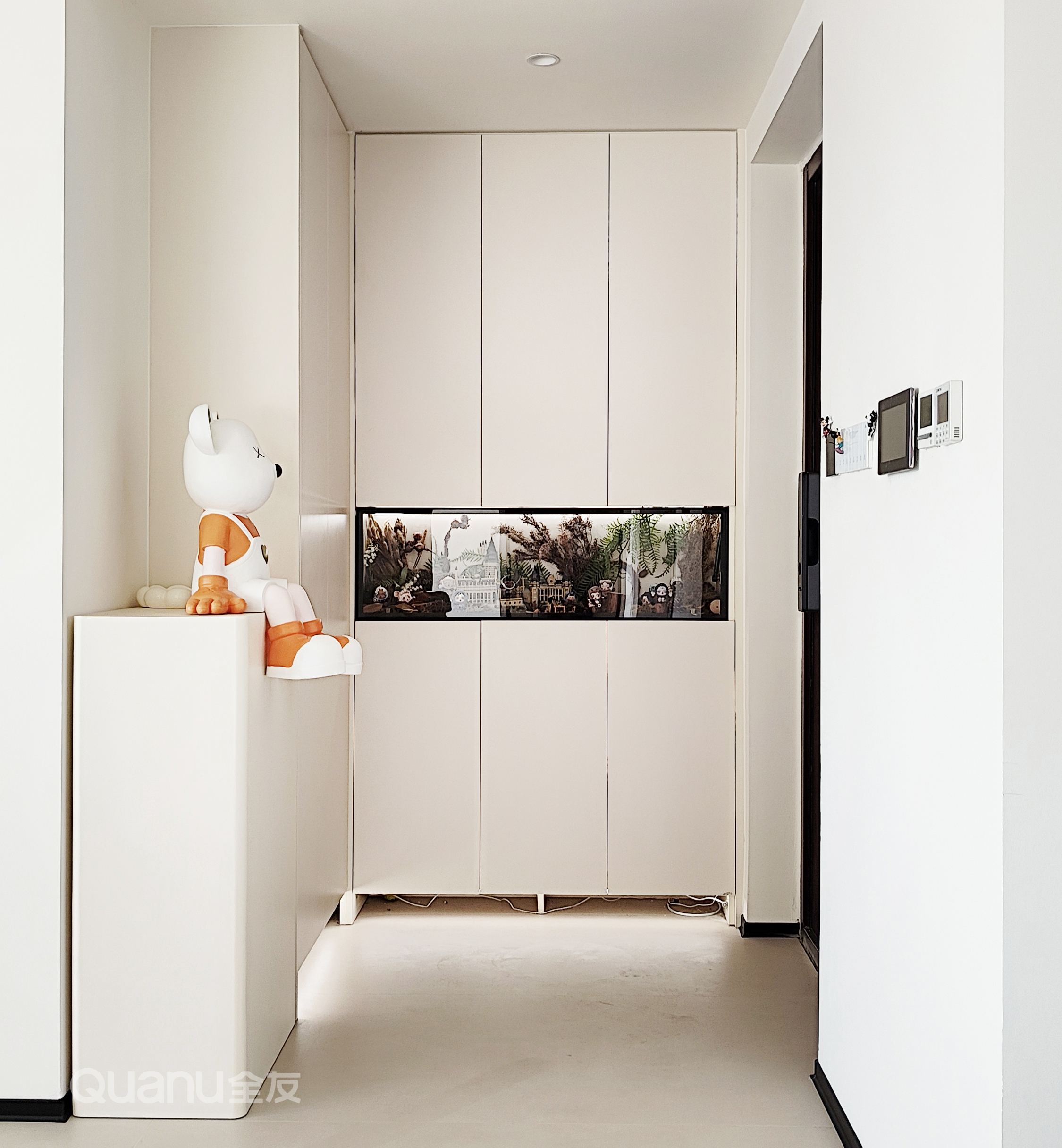 進(jin)們(men)定製(zhi)L型玄關櫃,一(yi)傢(jia)人(ren)的(de)鞋物(wù)被輕松收納,底部(bu)留空并內(nei)嵌感應燈帶,進(jin)們(men)即亮,打造(zao)出歸傢(jia)儀式(shi)感。
