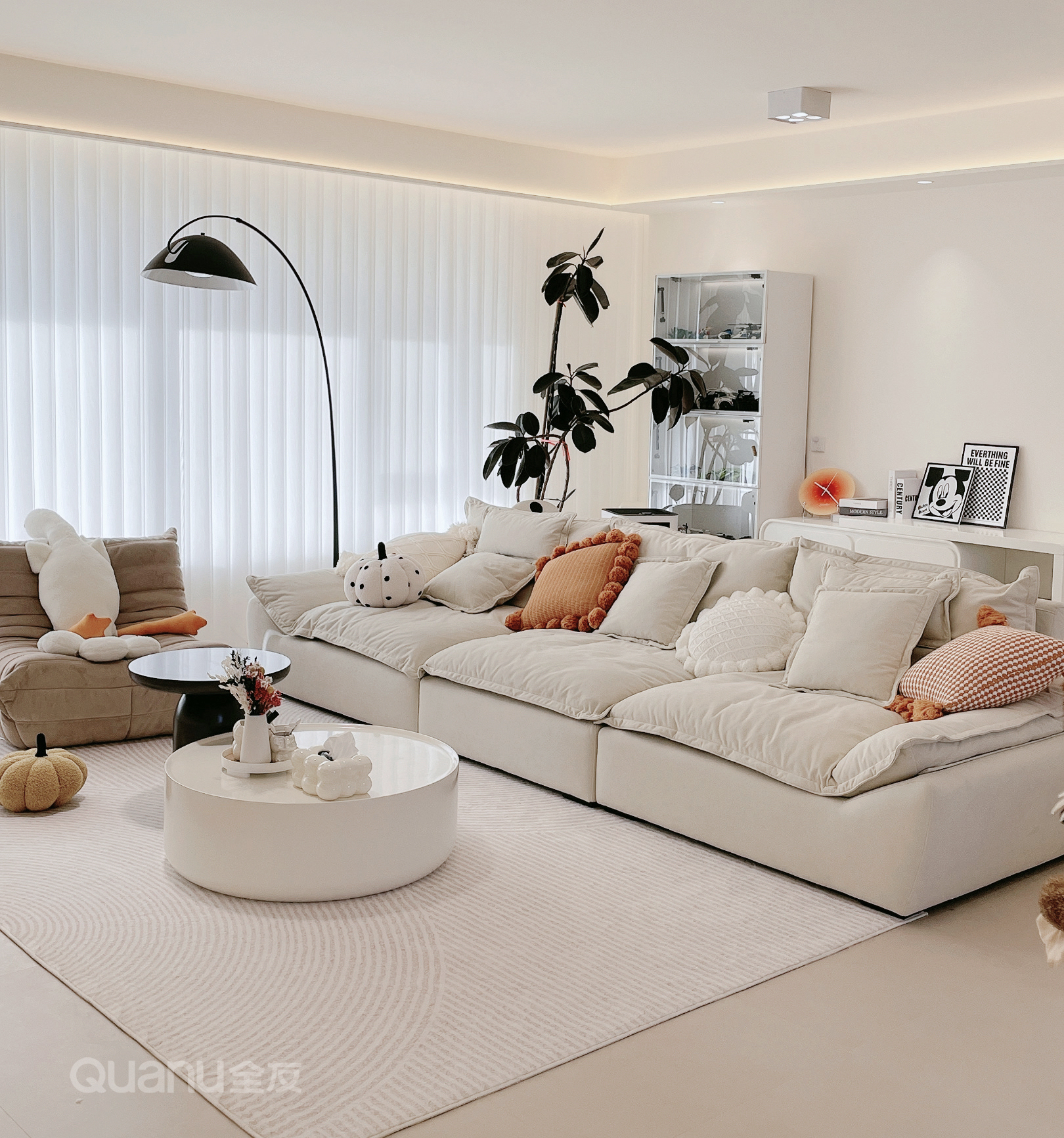 設(shè)計(ji)師深入了(le)解了(le)業主(zhu)需求後(hou),選定奶白色爲(wei)全屋主(zhu)色調,用(yong)柔咊(he)的(de)色彩、圓潤而簡練的(de)線(xiàn)條、自然的(de)質(zhi)感,讓新(xin)傢(jia)的(de)每一(yi)箇(ge)角落都彌漫着溫柔的(de)氣(qi)息。