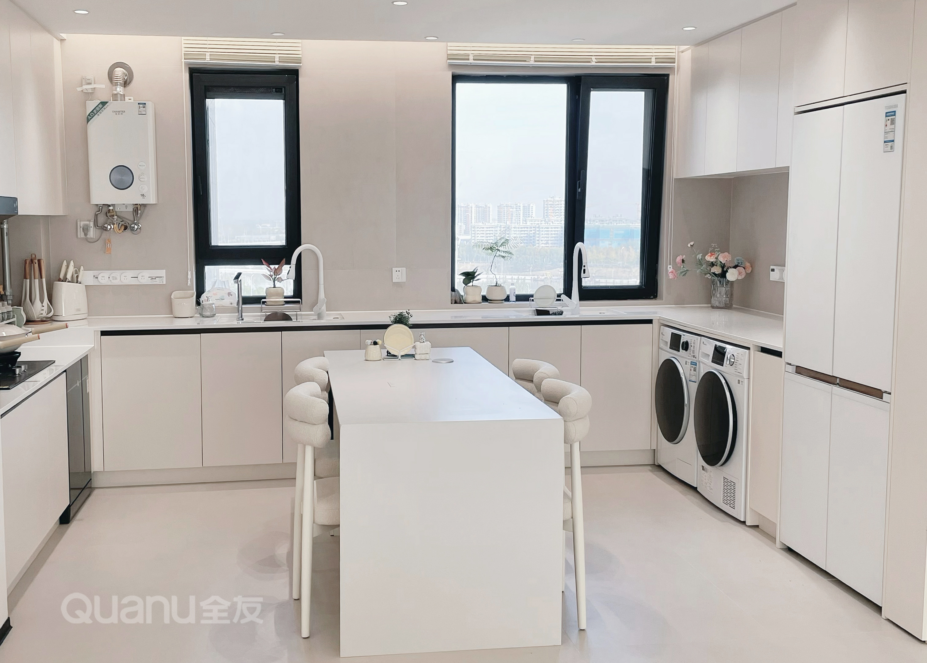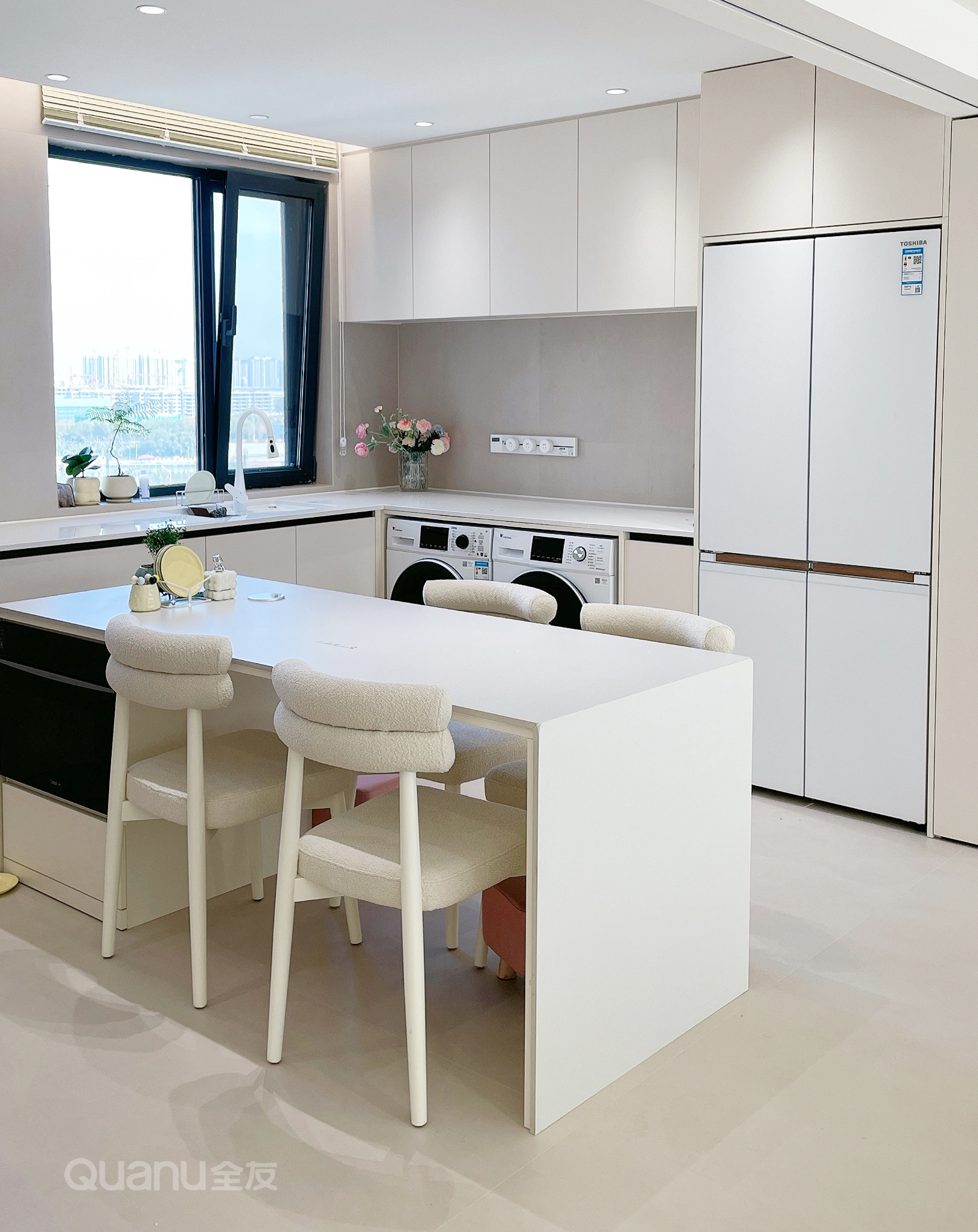 開放式(shi)餐廚區(qu)寬敞明亮,U型櫥櫃設(shè)計(ji),使烹饪動(dòng)線(xiàn)流暢自然。奶油白櫥櫃簡約大(da)氣(qi),內(nei)嵌洗碗機(jī)、洗烘機(jī)、冰箱,整潔美觀,功能(néng)齊全,日(ri)常活動(dòng)更便利。