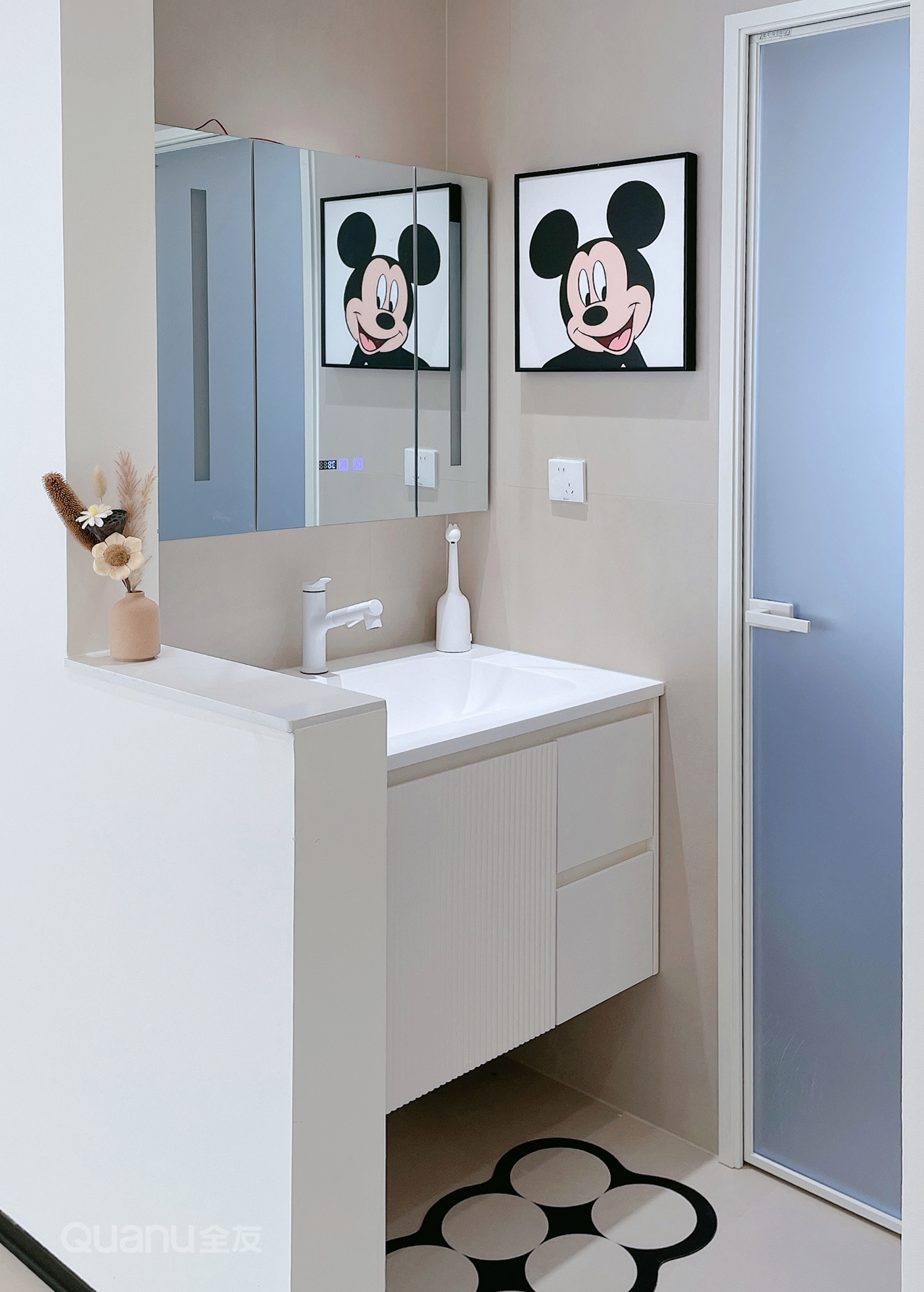 爲(wei)實現(xian)衛生(sheng)間幹濕分(fēn)離,設(shè)計(ji)師将洗手檯(tai)外移,半牆設(shè)計(ji)也(ye)使空間顯得開闊通(tong)透。奶油風浴室櫃簡約有(yǒu)質(zhi)感,讓這箇(ge)小(xiǎo)區(qu)域(yu)更顯溫馨。