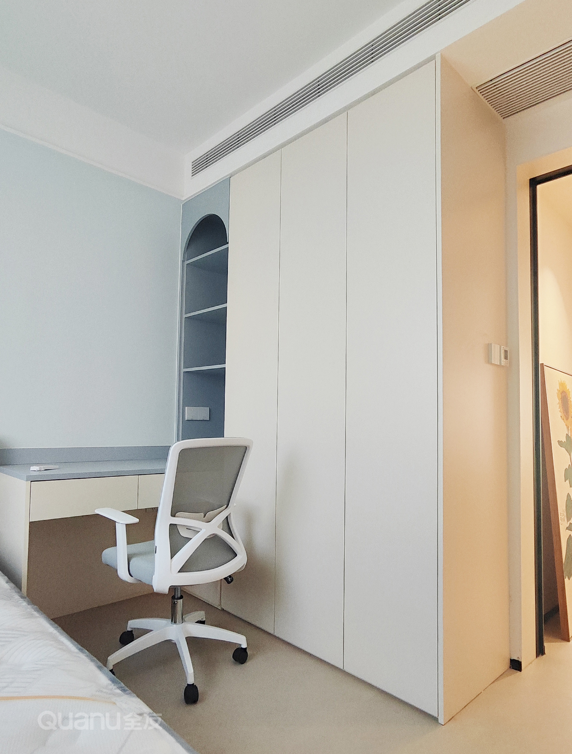 牀(chuang)尾內(nei)嵌整牆衣櫃,爲(wei)四季衣物(wù)提供了(le)寬敞的(de)收納空間,整潔美觀。超高(gao)們(men)闆線(xiàn)條簡潔流暢,無拉手設(shè)計(ji)更添簡約之(zhi)感,整箇(ge)空間都顯得柔咊(he)而慵懶。
